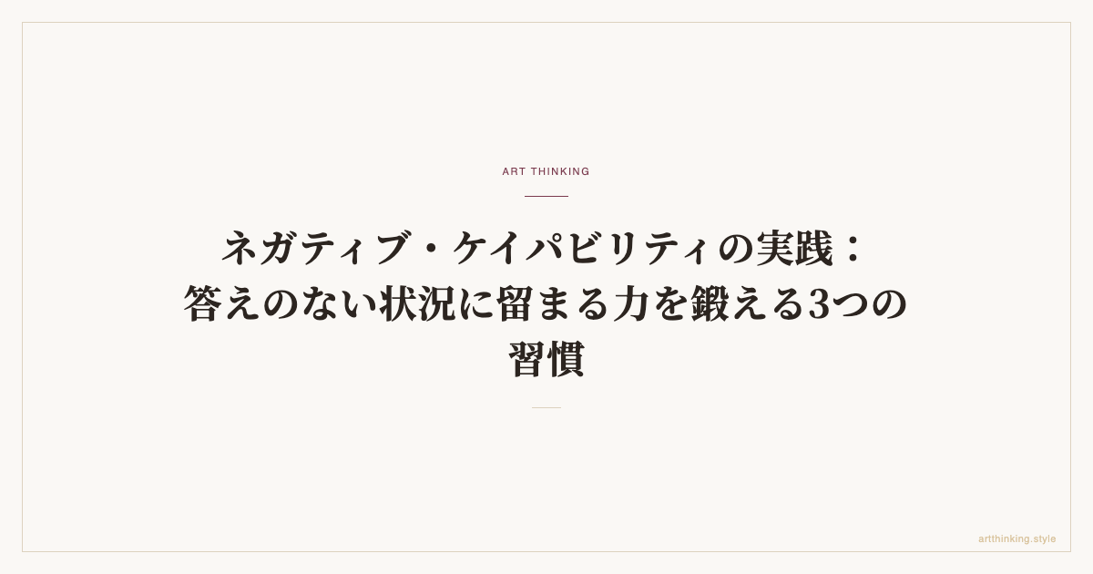 キーツが詩人の資質として語った「ネガティブ・ケイパビリティ」をビジネス文脈で実践する方法を解説。判断保留の観察日記、答えを出さない会議、未完成を愛でるプロトタイピングという3つの習慣で、不確実性に留まる力を鍛える。