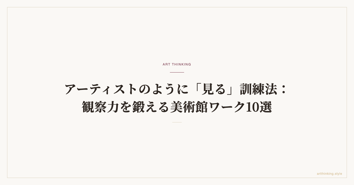 美術館を「観察力のジム」として活用する10の具体的ワークを紹介。VTSから逆さ鑑賞、色彩マッピング、触覚想像まで、手順・所要時間・期待効果と、ビジネスへの転用例を解説する。
